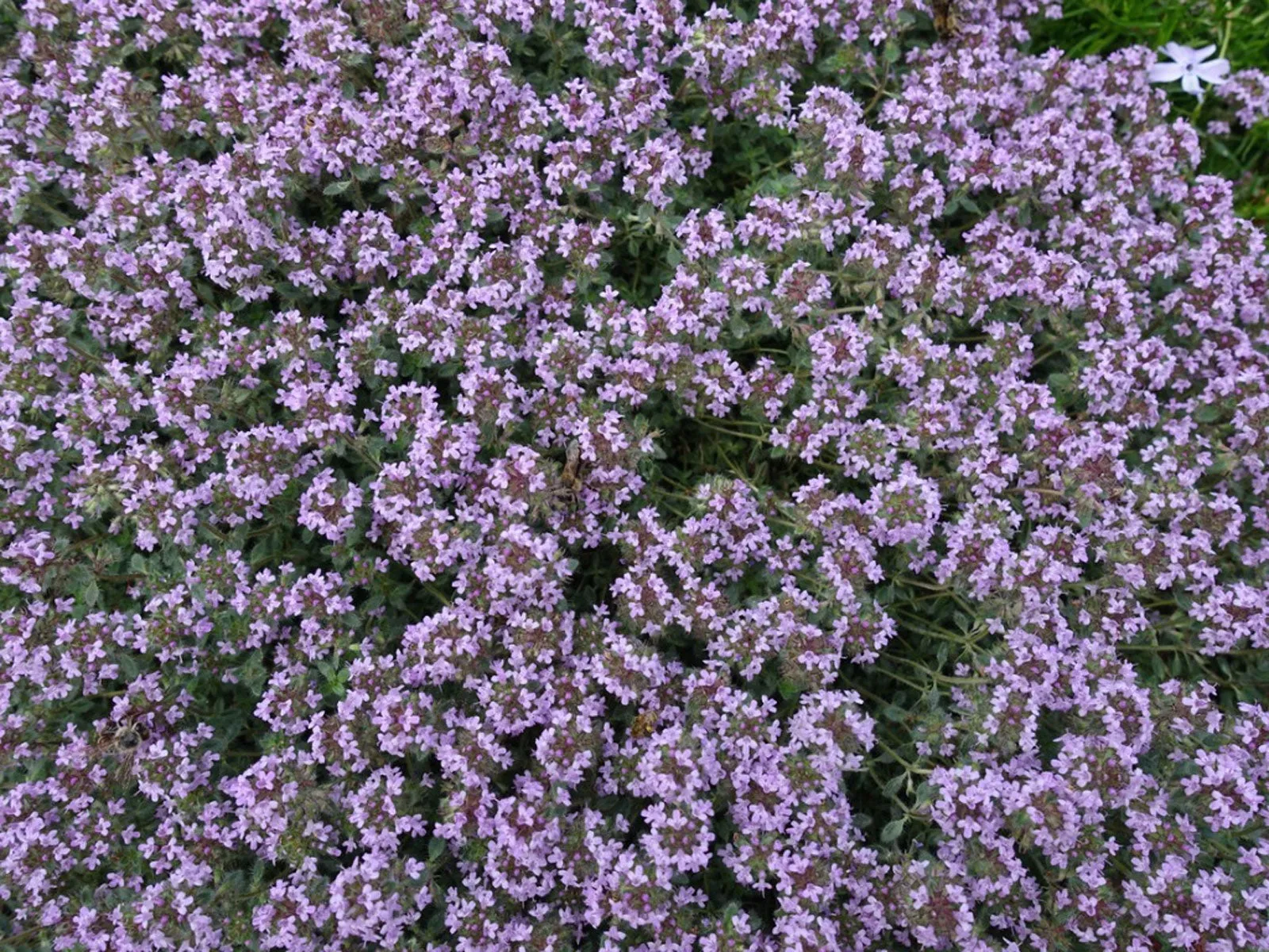 One alternative to thirsty turf grasses is a wonderful plant called creeping thyme often used in drought-tolerant landscapes, or xeriscaping. It offers homeowners benefits such as no mowing, drought tolerance, spring flowers, and a durable texture that can handle moderate foot traffic. Creeping thyme maintains a height of about 1- 2 cm and creeps horizontally rather than vertically.