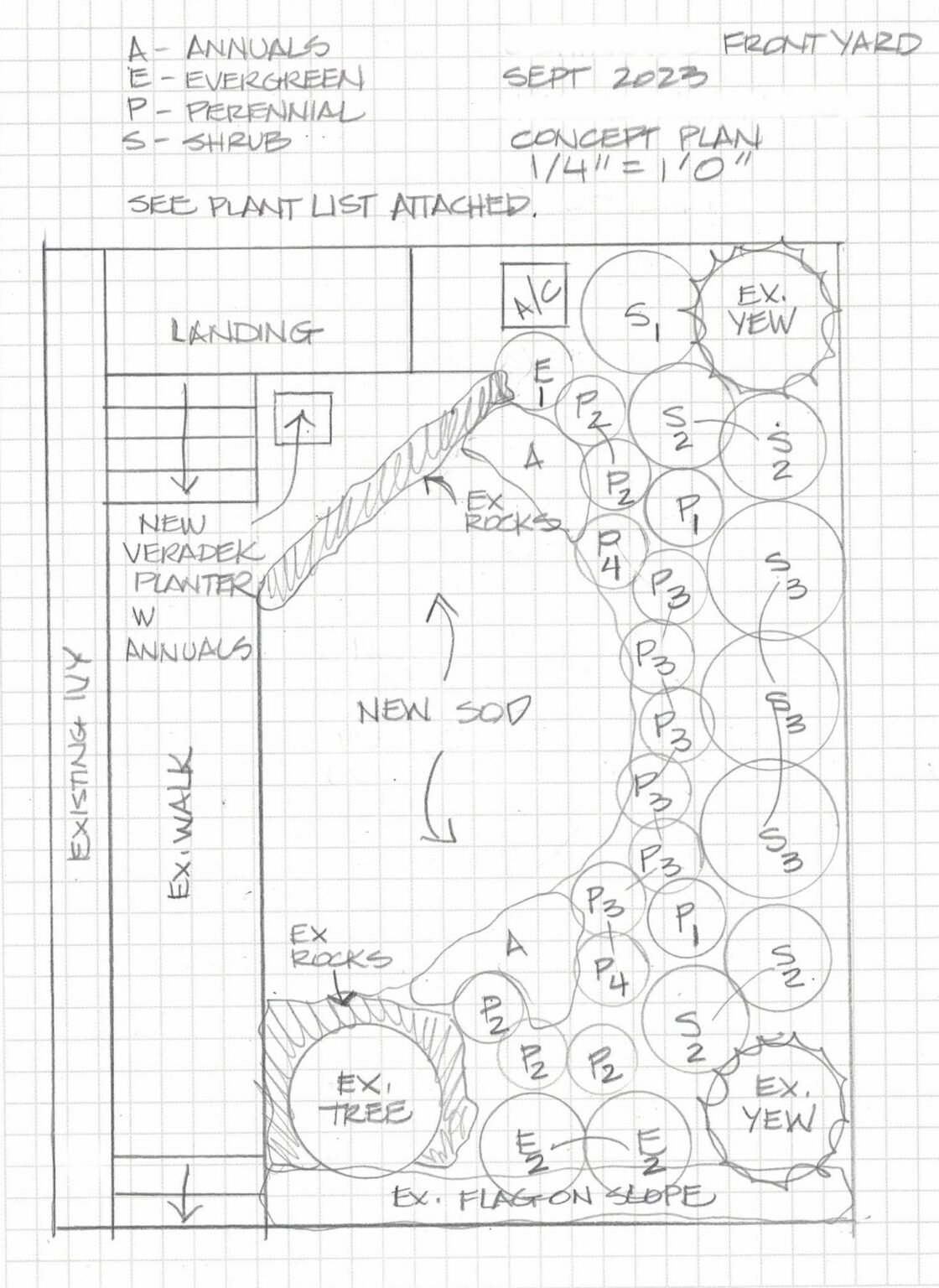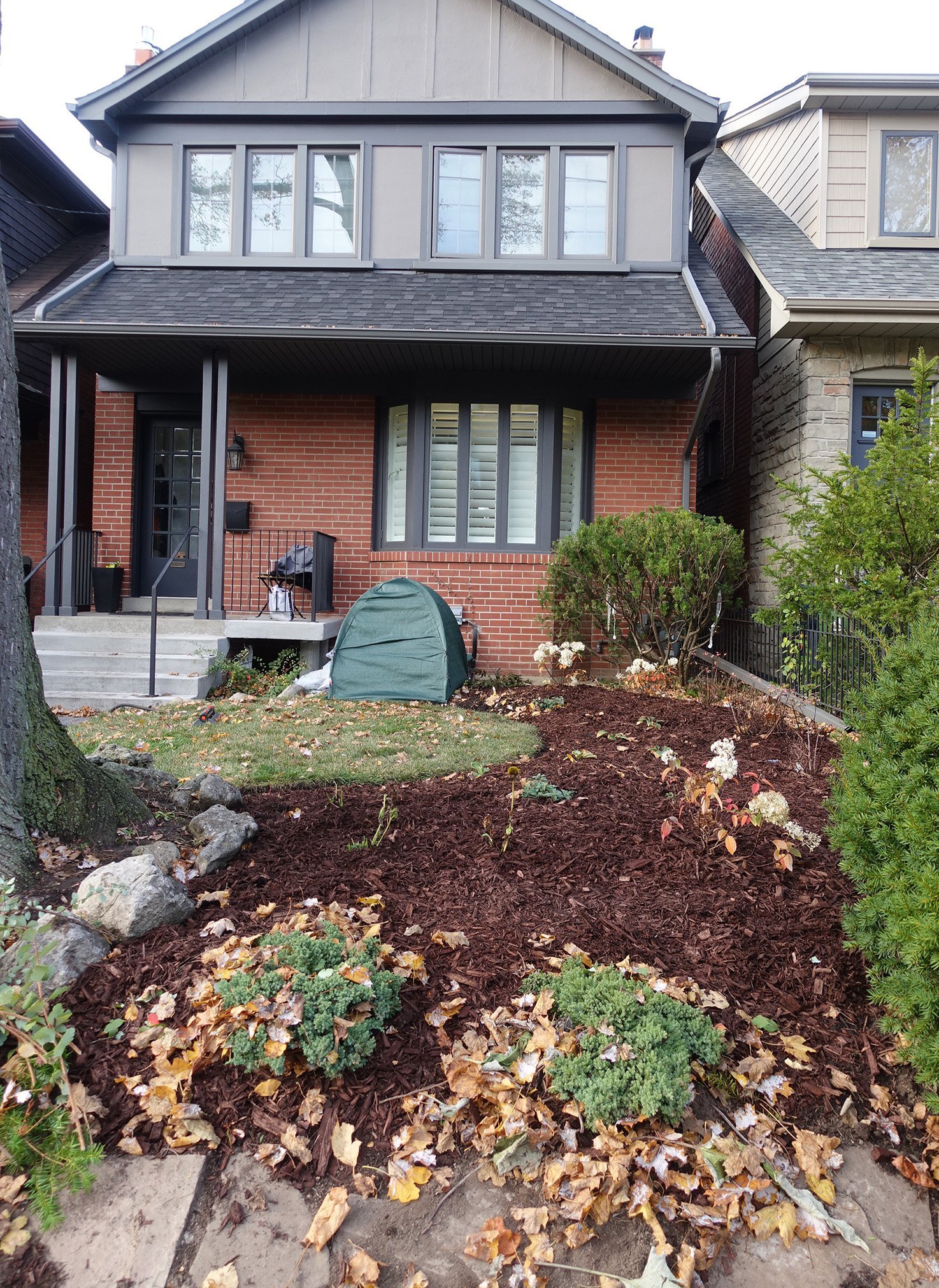 This mid-town client approached me to help him create a more attractive garden for his front and backyard. We designed a garden for him within his budget and installed it in the late Fall. The garden is low maintenance and has plants such as creeping juniper, diervilla, giant sedum, echinacea and beechleaf spiraea, that are suitable for this dry site under a large maple tree.