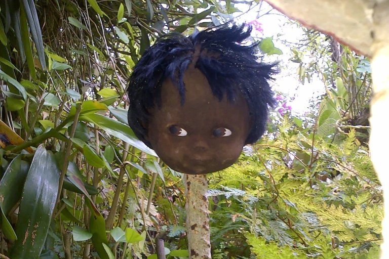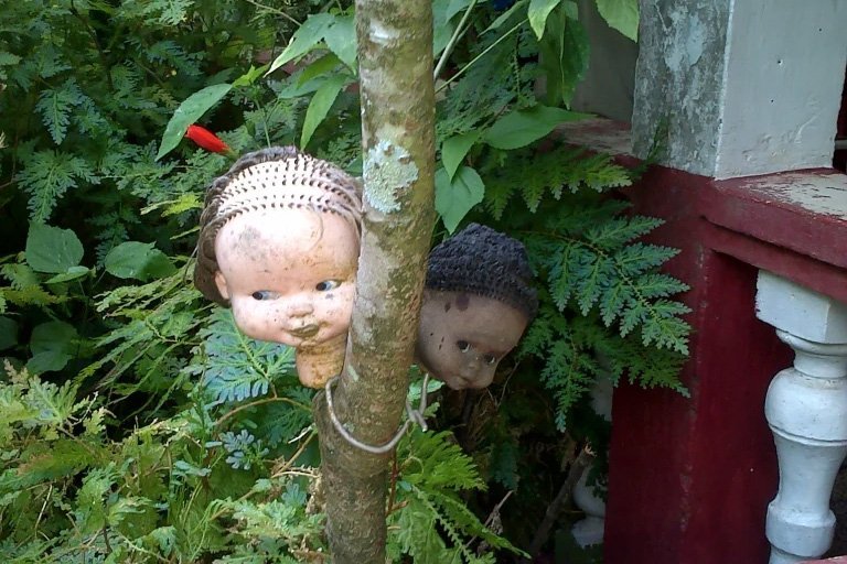 There are eccentric elements such as doll heads attached to trees in the gardens.